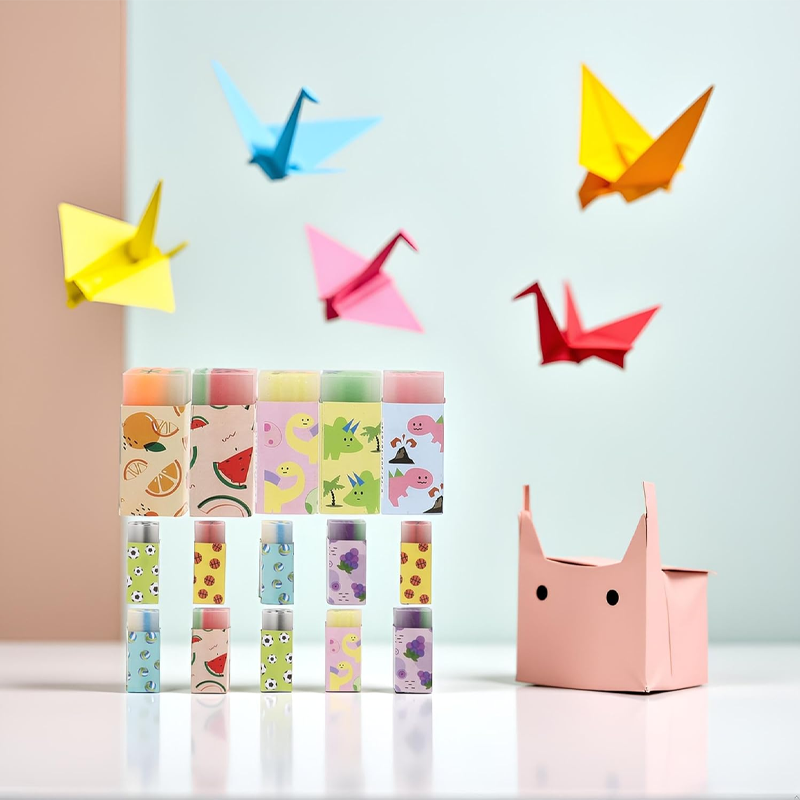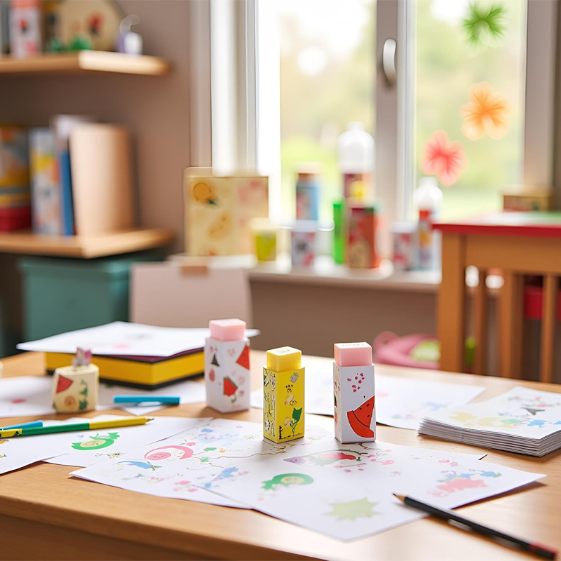 - Brighten up your art supplies with our three-piece set of adorable fruit erasers in random colors! These fun food-themed erasers are a great choice for rewarding students, party favors, or prizes. Each set includes a variety of fruit designs to inspire children’s creativity and keep them entertained. They’re perfect for art supplies, adding a touch of whimsy to any stationery collection and making erasing a delightful experience.It does not incorporate patented designs, licensed patterns, or trademarked elements.