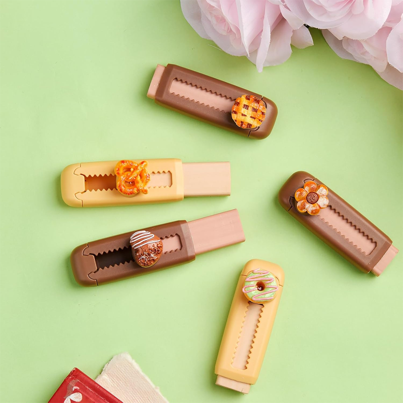 - Add a touch of creativity to your school supplies with these adorable bread-shaped retractable erasers! These uniquely shaped erasers, designed to resemble different types of bread, are incredibly cute and suitable for children, boys, girls, and students of all ages. The push-to-retract design makes erasing fun and hygienic; their realistic shapes also make them the perfect addition to any stationery collection. Whether used in the classroom, for art projects, or as a gift, these erasers will add a touch of fun to everyday learning!It does not incorporate patented designs, licensed patterns, or trademarked elements.